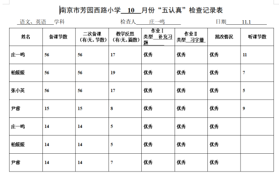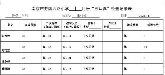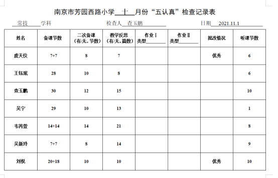 为了积极落实“双减”背景下的提质增效,加强教学管理,2021年11月1日,教务处组织教研组长对所有任教老师进行“五认真”检查。内容主要包括教师的学科计划制定、备课、听课记录、作业批改等方面。