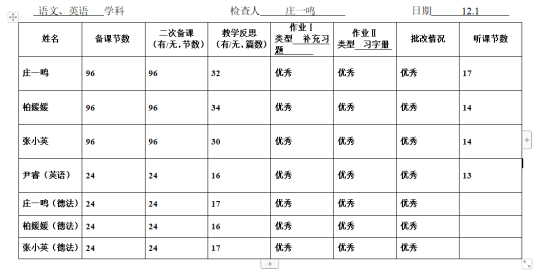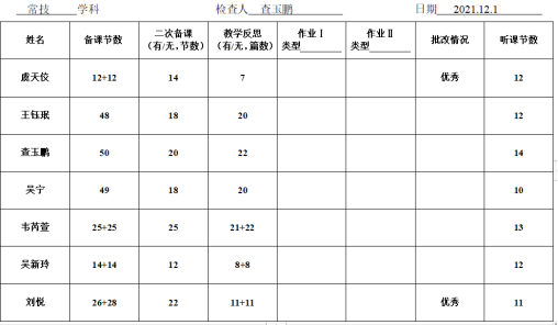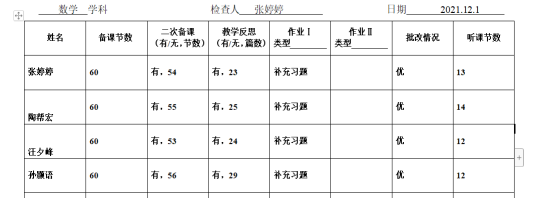 为了积极落实“双减”背景下的提质增效,加强教学管理,2021年12月1日,教务处组织教研组长对所有任教老师进行“五认真”检查。内容主要包括教师的学科计划制定、备课、听课记录、作业批改等方面。