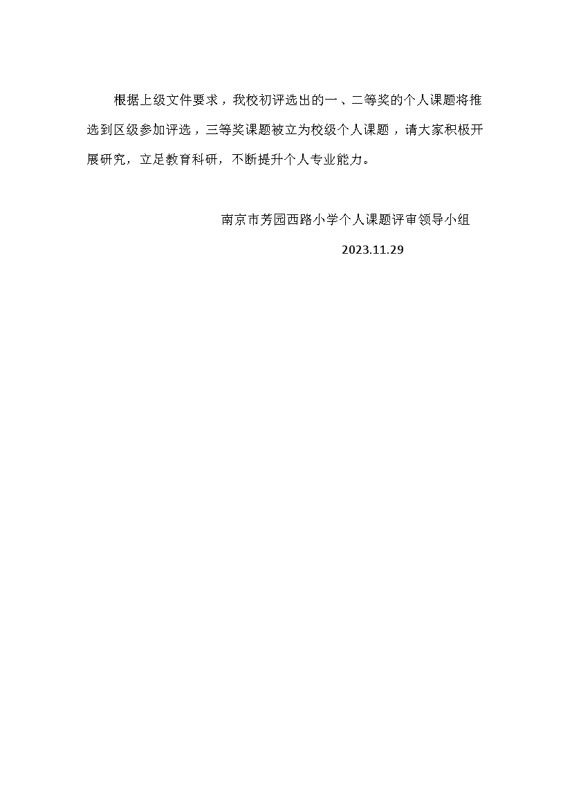 关于公布南京市芳园西路小学2023年度个人课题评选结果的通知